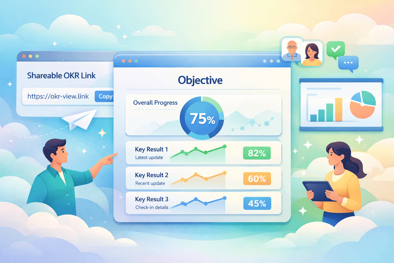 Presentation View creates a public, shareable page for any OKR in your workspace. Think of it as a mini OKR dashboard dedicated to a single objective.