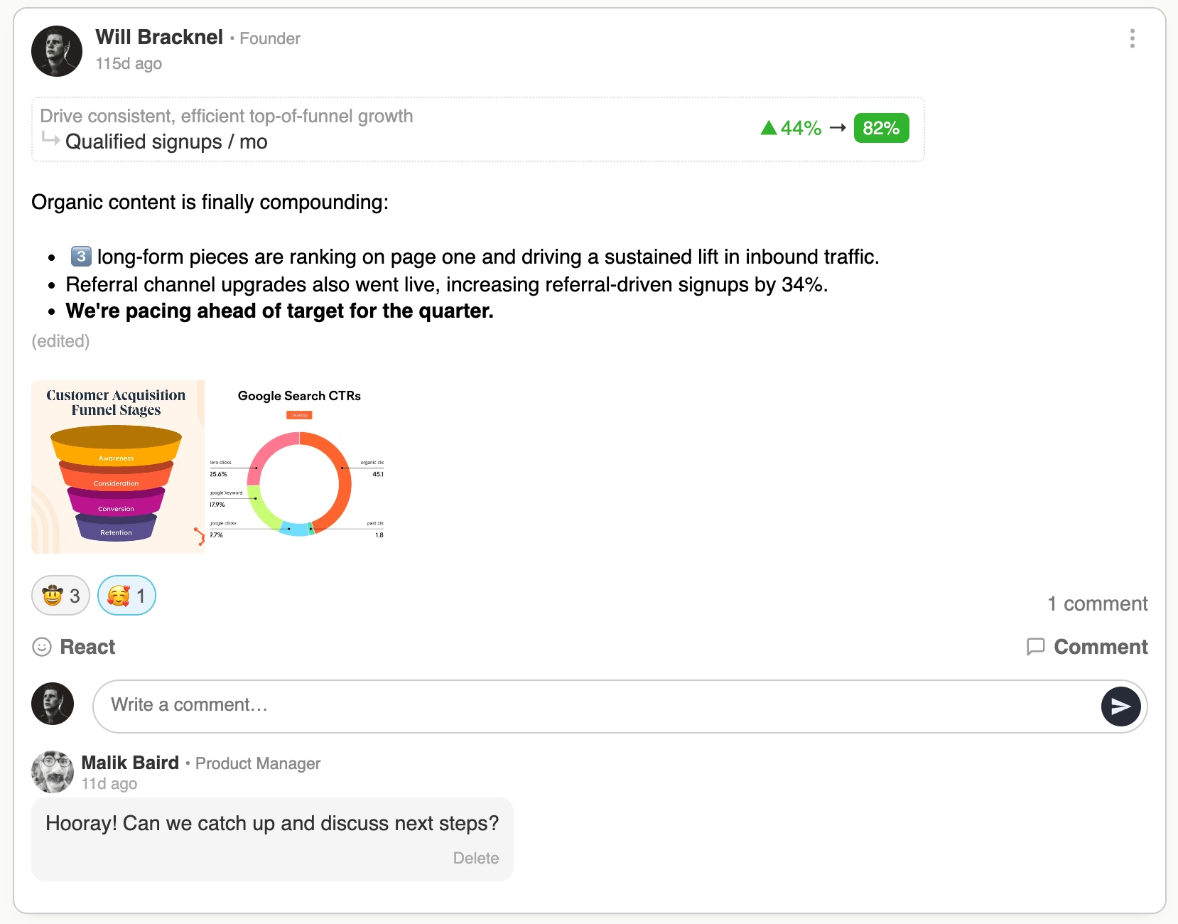 Open the feed and post your next check-in. Add a key metric, a short update, and a screenshot if it helps. React to a few updates from other teams and leave a comment where you can add value.
