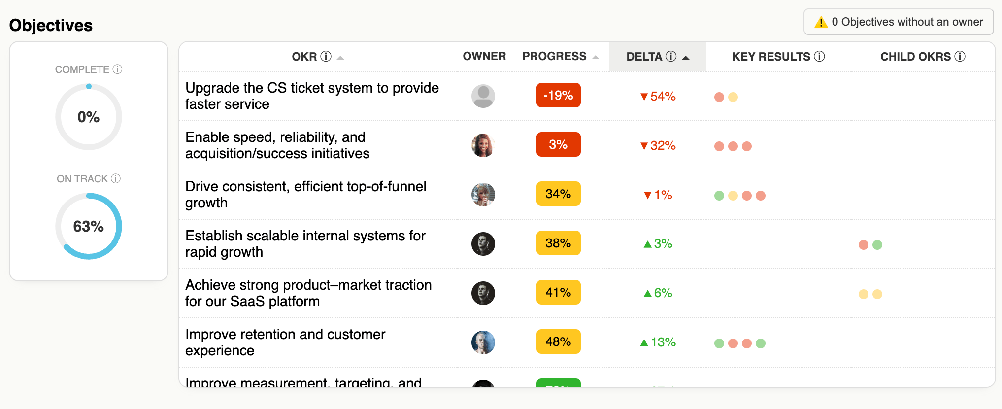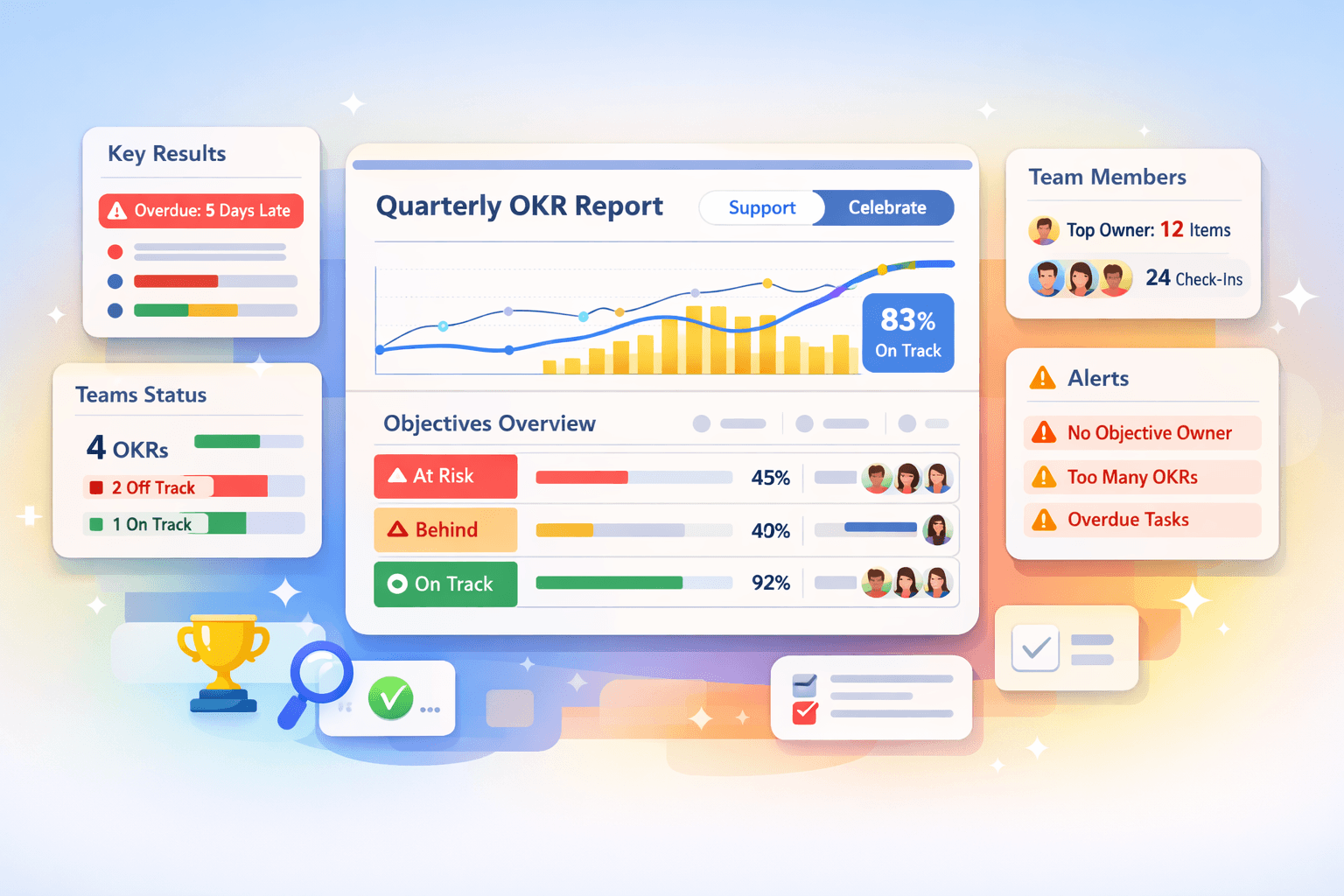 Support sorts items that need attention to the top. You see Objectives that are behind, Key Results that are overdue, and areas where progress is slipping. You can step in early, ask better questions, and unblock work before it stalls.